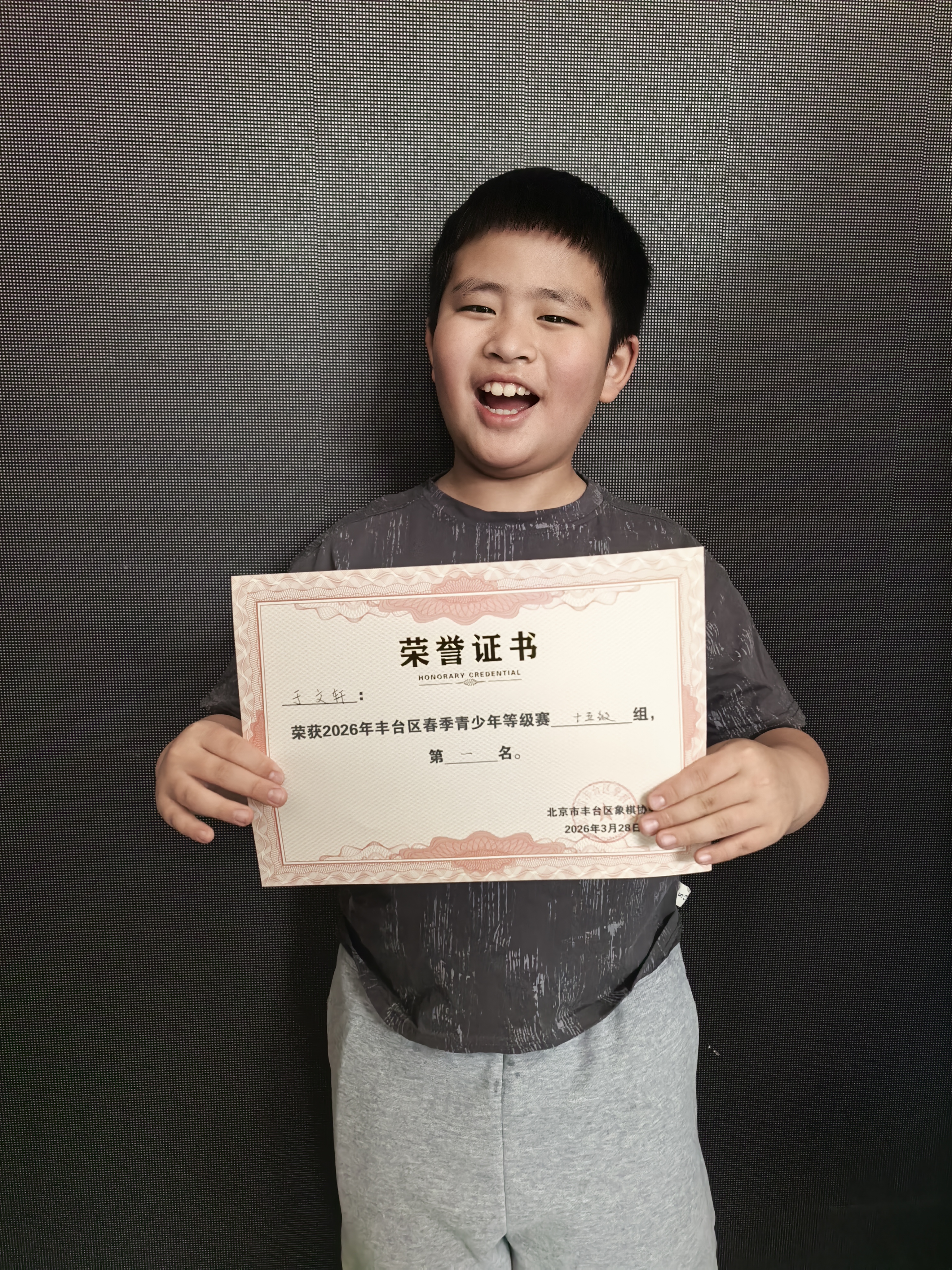 在3月28日举办的2026年丰台区青少年春季象棋等级赛上,弈修堂3位参赛同学全部晋级,其中于文轩获15、14级合并组冠军,甄翊程获7级组第五名,以下是晋级名单和赛场花絮: